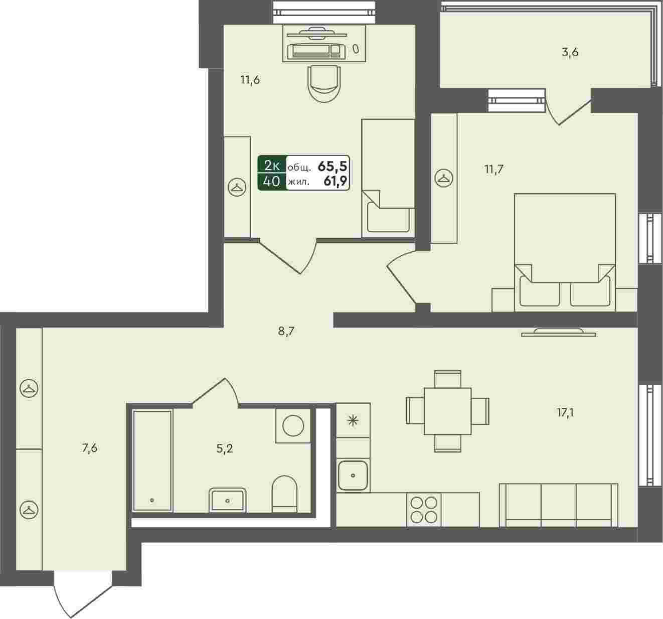 2-комнатная квартира, 65.5 м²