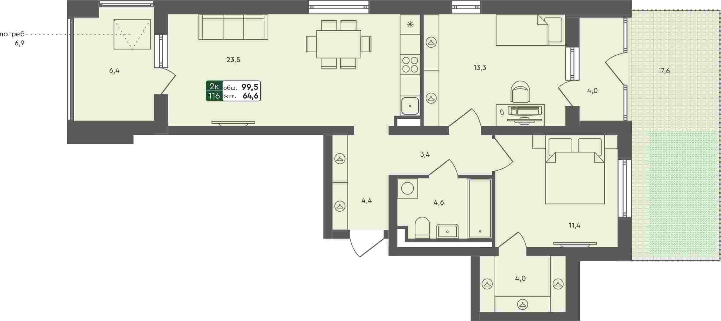 - 2-комнатная квартира, 99.5м²
