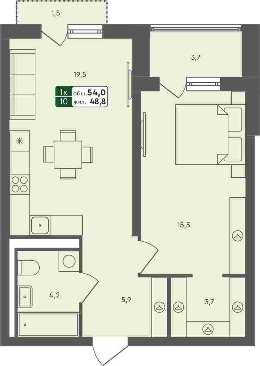 1-комнатная квартира, 54 м²