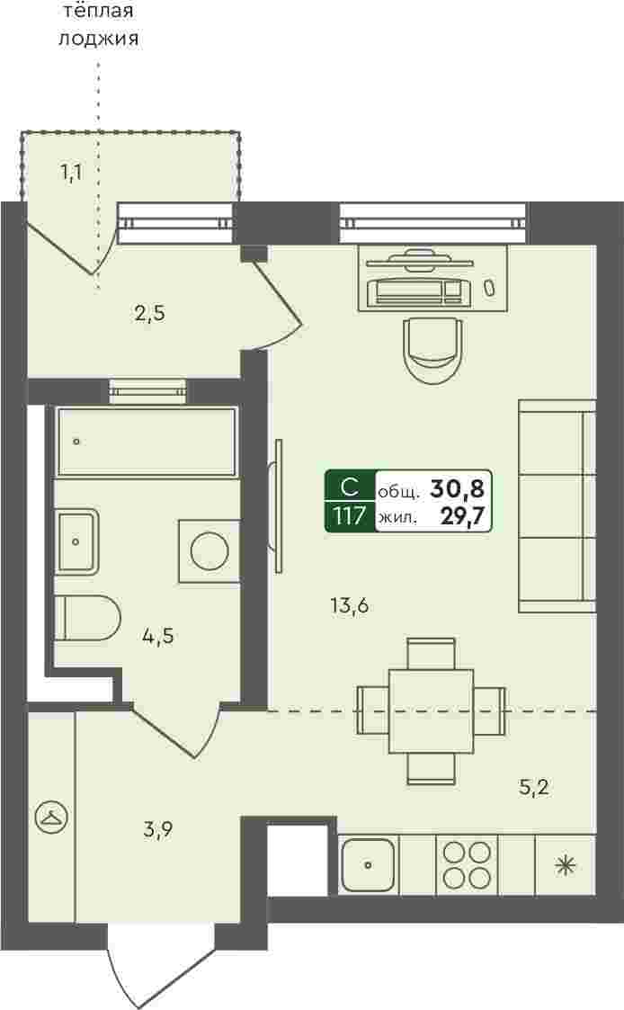 - Студия квартира, 30.8м²