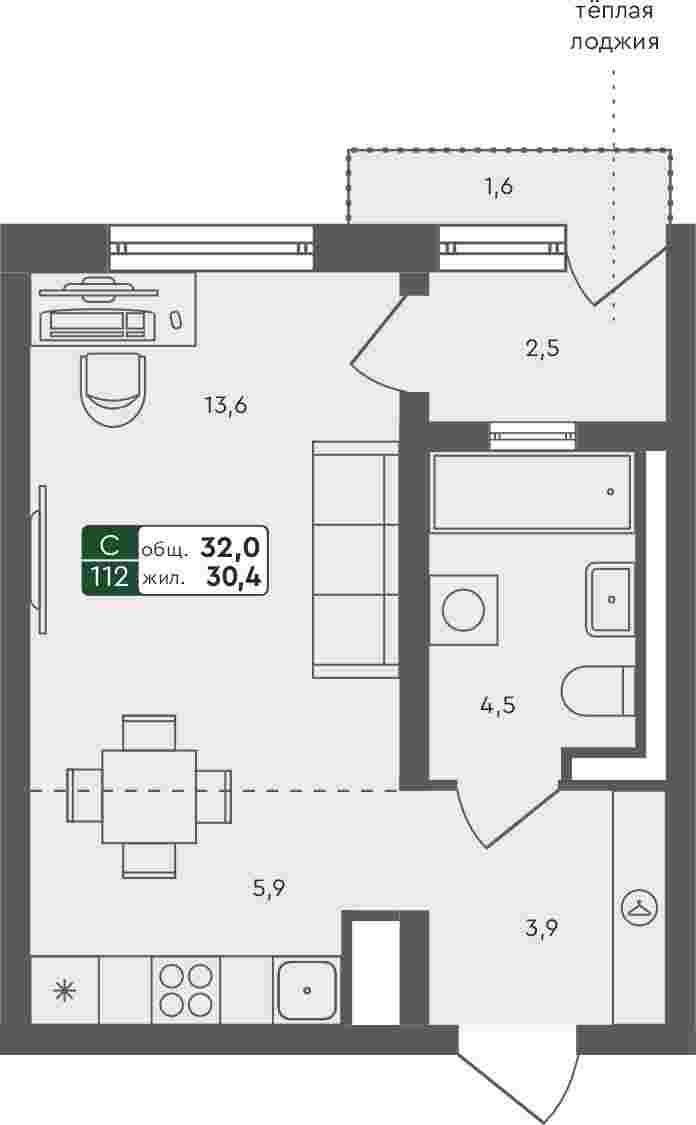- Студия квартира, 32м²