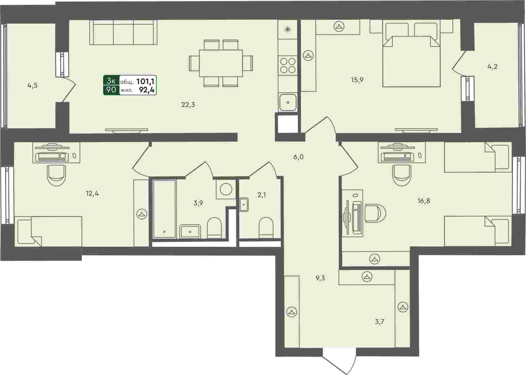 3-комнатная квартира, 101.1 м²